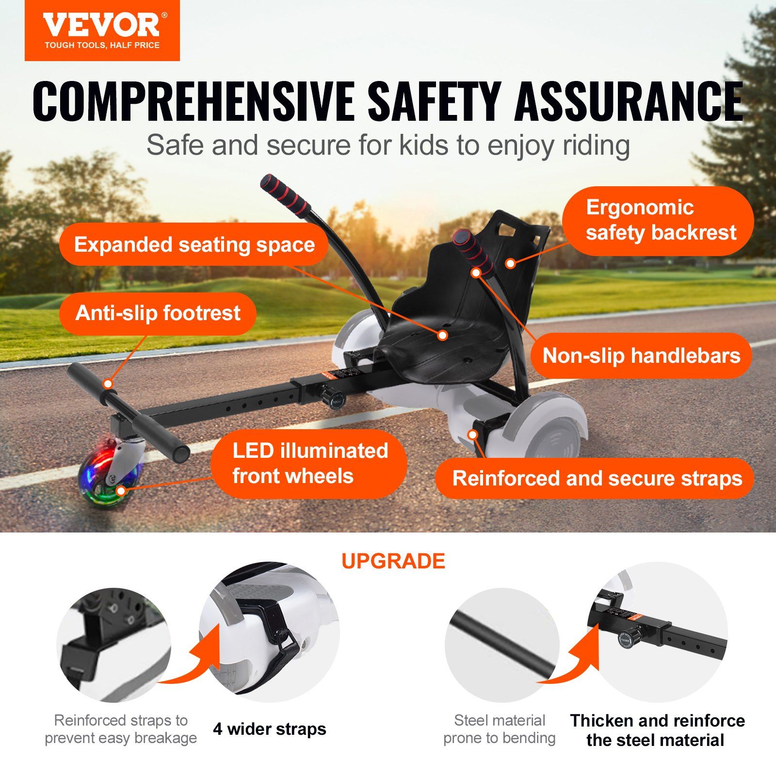 Home > VEVOR Hoverboard Seat Attachment, for 6.5" 8" 8.5" 10" Hoverboards, with LED Lights, Grips Control, Adjustable Frame Length and 220 LBS Load Capacity